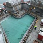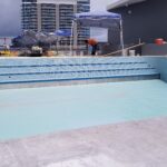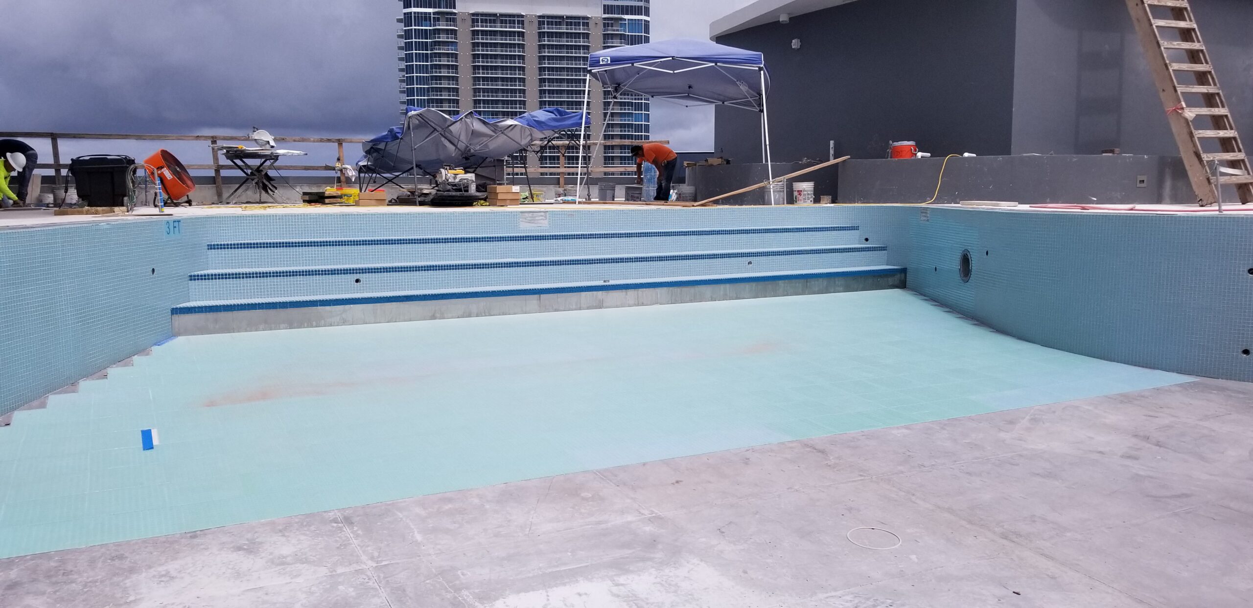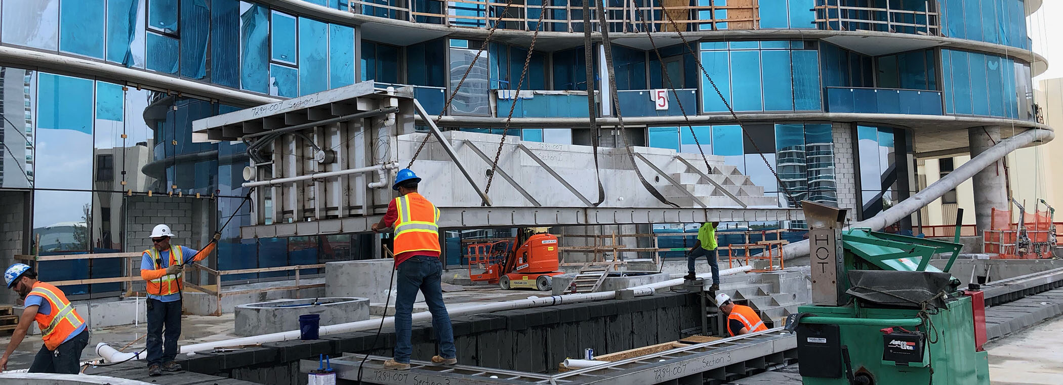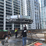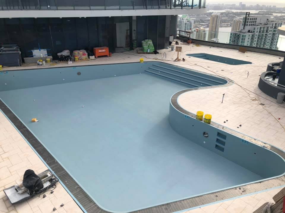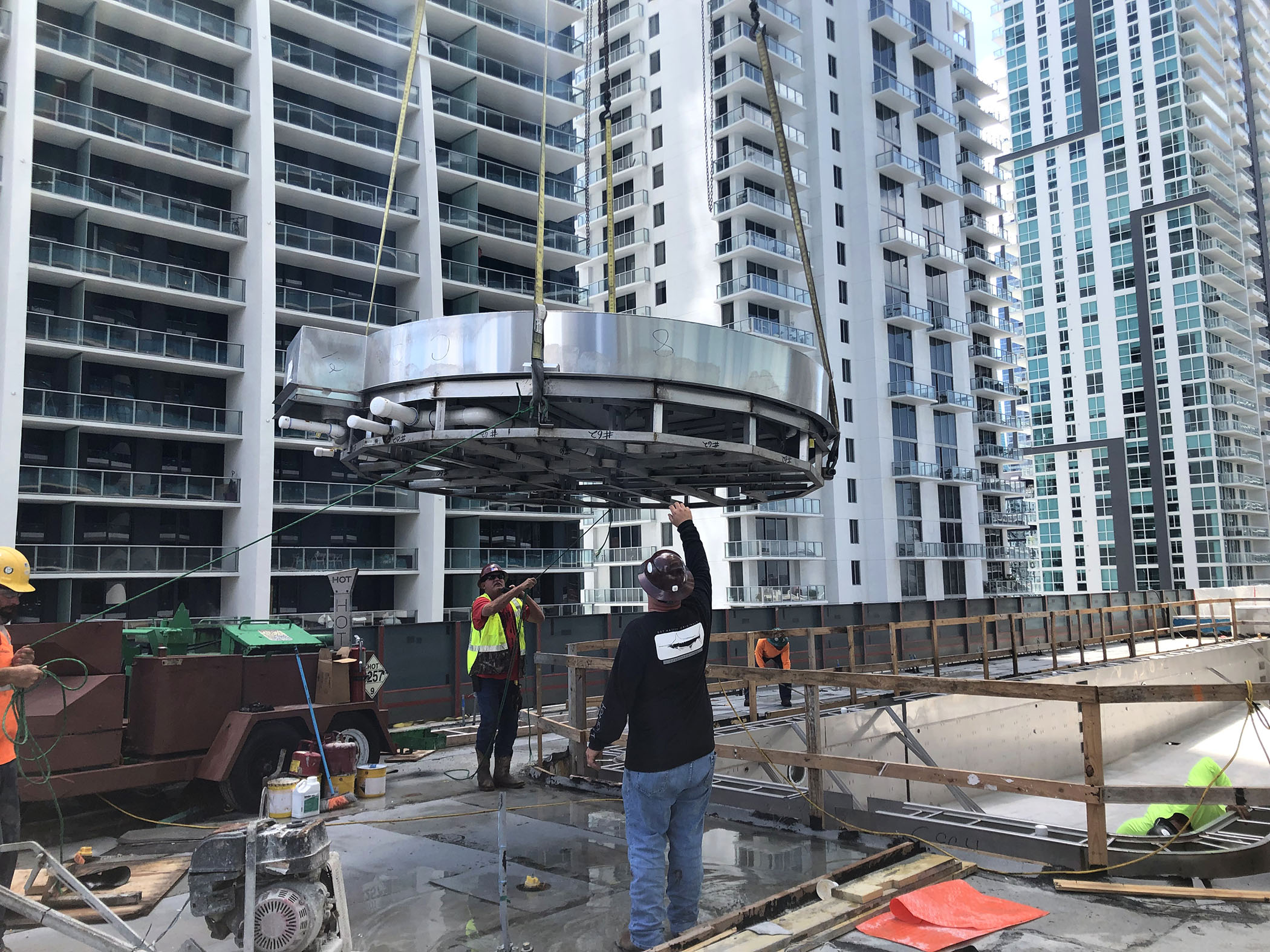 The 67-foot lap pool located on the exterior terrace of level 18 gives swimmers the uniquely urban experience of swimming between the soaring towers of Brickell. The pool arrived onsite in four sections where it was reassembled and fully welded by Bradford’s mobile team. A circular, 10’7″ diameter kiddie pool is also on the 18th floor. It arrived fully prefabricated in one piece, ready for tile and water.