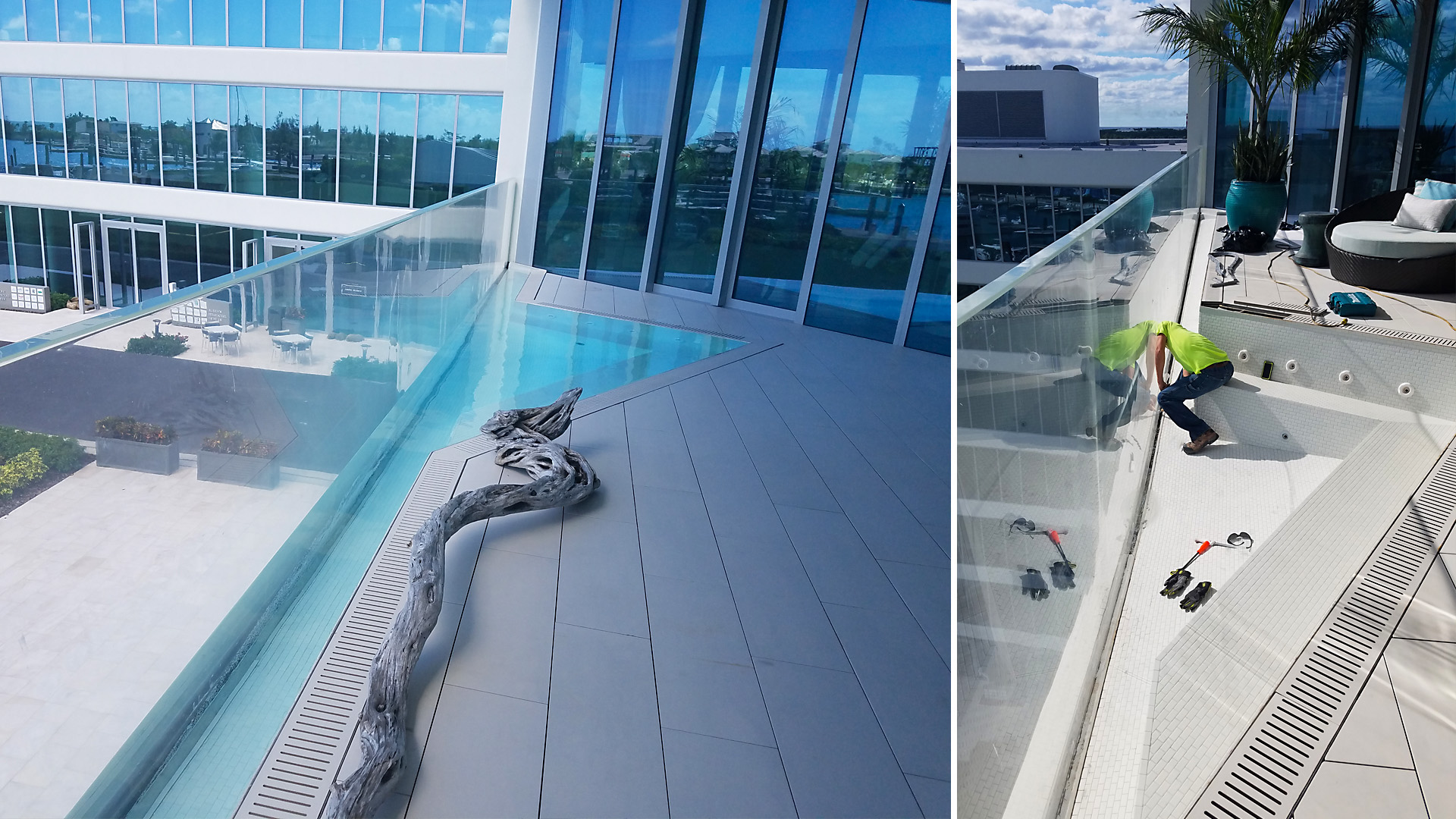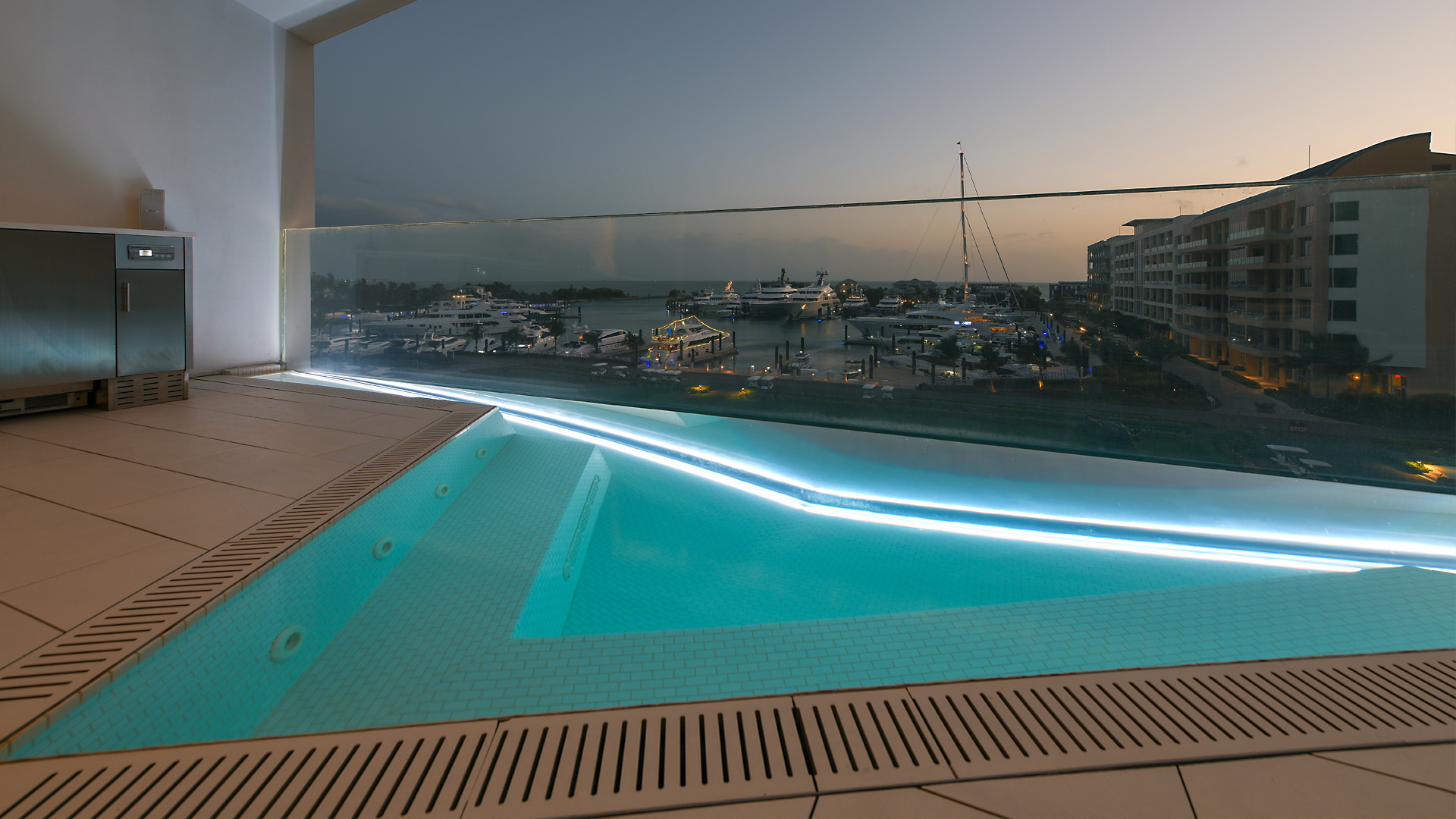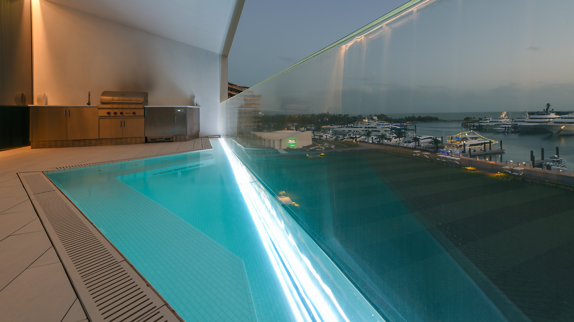 Elegantly designed to vanish into the architecture, the acrylic face of each pool spans the entire length of the balcony creating unbroken views of the marina from inside the unit. With a total of four design shapes, every in-suite pool was pre-fabricated at Bradford, shipped to the Bahamas, craned into place, water tested, and tiled onsite. To further elevate the experience, we designed in bench seating and soothing hydrotherapy jets, along with interior lighting to illuminate at night.