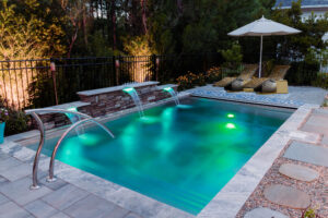 The length of the MPool is customizable up to 40 feet. To maintain efficient freight costs, the width of the pool is maximized at 12 feet. Every MPool features full-width dimpled stairs for added traction and a unique aesthetic. Homeowners choose between a full-width sun shelf, bench, or none for the opposing end.